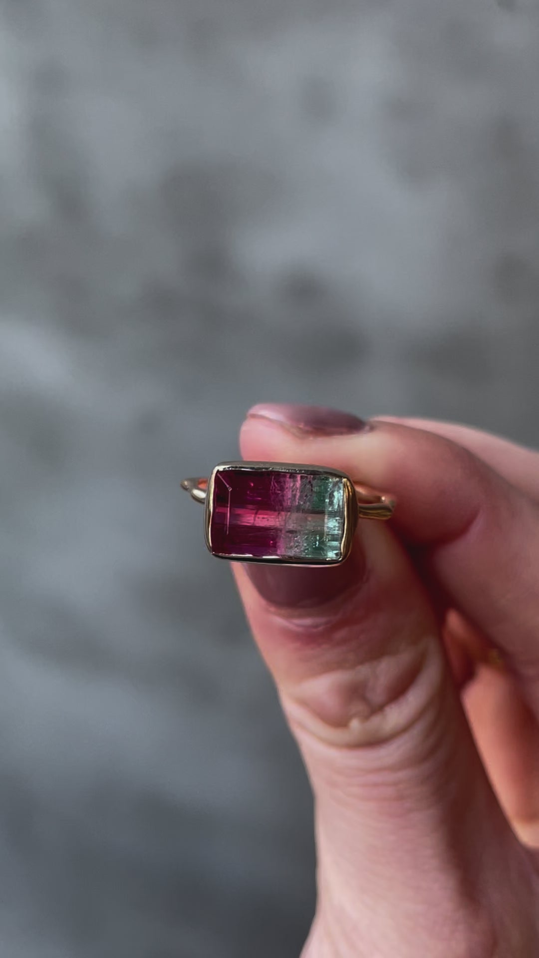 10月の誕生石として知られるトルマリン。"ない色はない"と言われるほど、多彩な色を持つのが特徴。コチラはピンクとグリーンの対極的なバイカラーが目を惹くトルマリン。