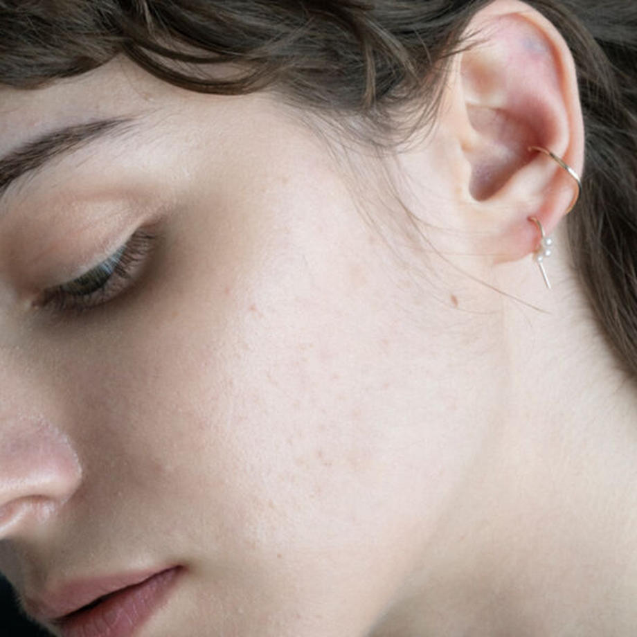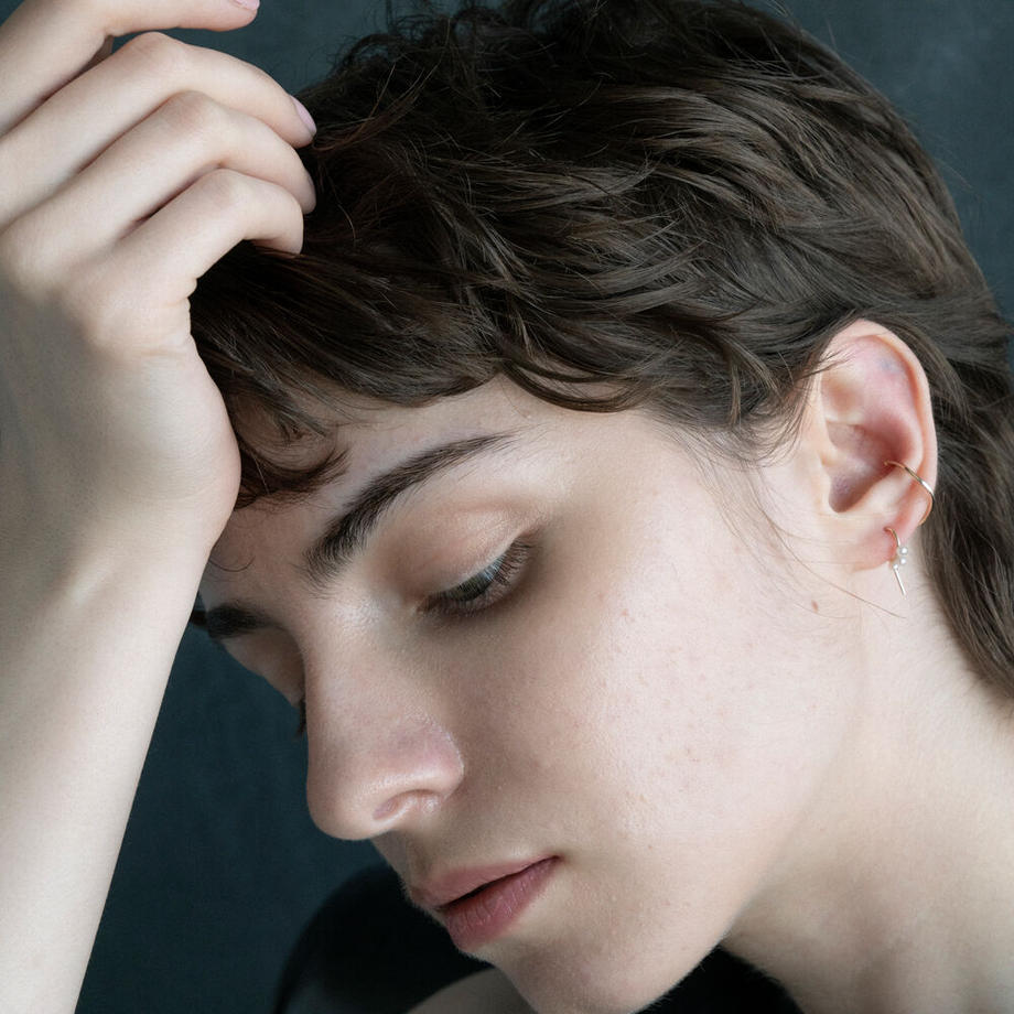 こちらのピアスは、ポストがピアスのデザインの一部となっているため、キャッチなしで着けていただけて、マスクをしていても落ちづらいデザインとなっております。